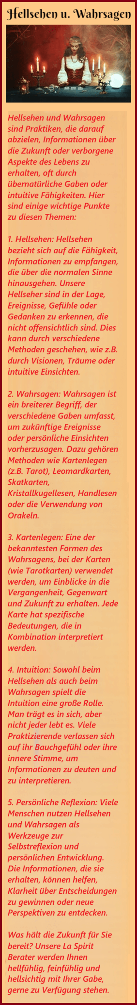 Spezialisiert auf Rundumblick.Hellsichtiges und treffsicheres Kartenlegen mit mehr als 25 Jahre Erfahrung.